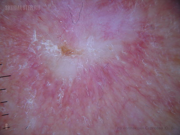 При осмотре: в области левого виска два сливающихся узелка до 0,7 см. в диаметре, ярко-красного цвета. При дерматоскопии четко выявляется характерная для кистозной формы базалиомы древовидная сосудистая сеть.
