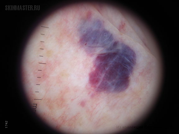 В этой локализации видно новообразование полусферической формы, неправильных очертаний и неравномерно возвышающееся над окружающей кожей. Цвет его синюшно-черный, что и вызвало замешательство врачей в плане дифференциальной диагностики с меланомой.
