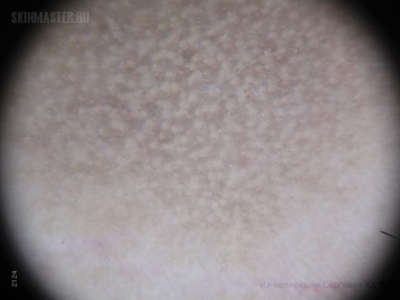 При дерматоскопическом исследовании выявляется диффузное распределение глыбок хроматина, на коже лба с образованием очажков невовлеченной кожи, создающей впечатление решета.